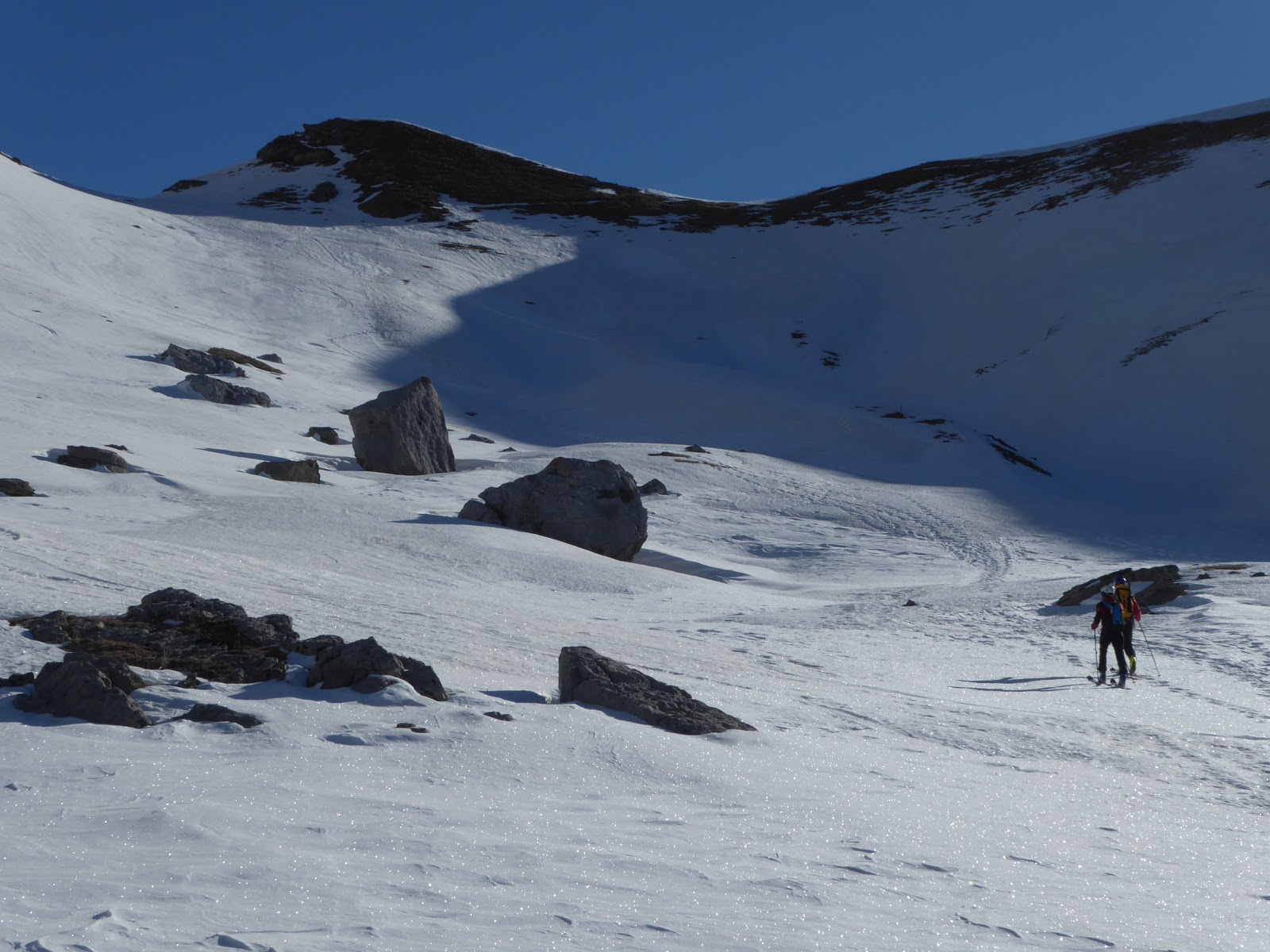 En el flanqueo, observábamos como el Valle de Igüer estaba sin nieve, lo que dejaba claro que la ascensión al Aspe por el sur tenía una buena porteada hasta la zona del embudo.