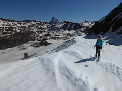 Porteamos apenas cien metros más que la vez anterior y en apenas cinco minutos calzamos los esquís. La ladera de orientación norte está con nieve continua, lo cual contrasta notablemente con su ausencia casi total de las zonas orientadas al sur.